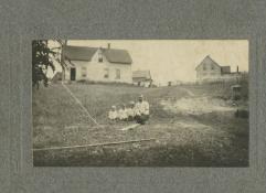 Photograph donated by Diane Munro. Photo of a man and three children in a field. Approximately 1895-1900.
