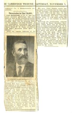 | McFarlane Article regarding John Nesbitt printed in the Cambridge Tribune, 5 November 1904 | Order of Scottish Clans Clan mackintosh Royal Chief W H Steen Illinois Royal Secretary Peter Kerr Boston Chief John Nesbitt Christiana McFarlane Nesbitt E D Avery Miss Mary Fraser Mr Frye Mr Simpson Miss Jennie Fraser Mrs Craigie Cambridge Massachusetts |