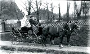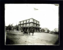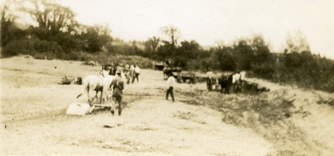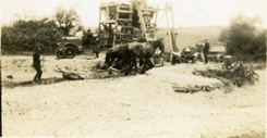 Andrew Marshalls home on Frasers Mountain. Flower garden contains lilies of the valley and roses with orchard at the other side. The barn is on the other side of the wagon.