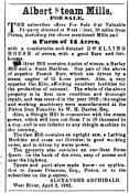 | Albert Steam Mills: For Sale Taken from the April 3, 1862 issue of the Eastern Chronicle. Advertisement placed by Alexander Archibald selling the Albert Steam Mills in West River. | W.M. Davies Pictou Pictou Iron Foundry newspaper Eastern Chronicle Albert Steam Mills Alexander Archibald | ||