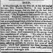 Obituary for Mrs. Susan Horton printed in The Colonial Partriot on January 11, 1828.