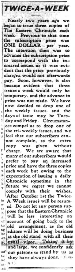 | Twice-a-Week Brief message to subscribers of the Eastern Chronicle in 1913 about changing from three issues a week to two. | newspaper article Eastern Chronicle twice weekly issues | ||