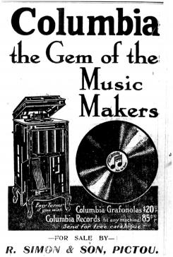 Advertisement for R. Simon & Son, Pictou's Columbia Records and Gradonolas, from the August 11, 1916 edition of the Pictou Advocate