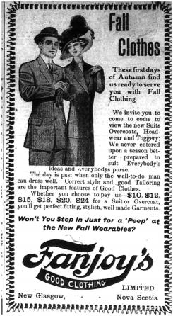 | Fanjoy's Good Clothing Ad Advertisement for Fanjoy's Good Clothing store in New Glasgow, from the September 24, 1913 edition of the Eastern Chronicle | advertisement Fanjoy's New Glasgow 1913 | ||