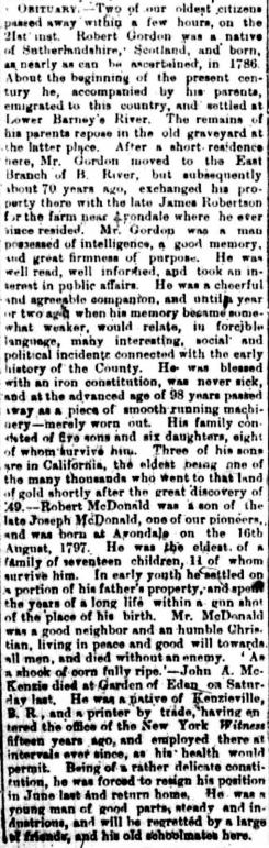 Avondale   Barneys River   Kenzieville   Garden of Eden   Sutherlandshire   obituary 1884   California   Joseph McDonald