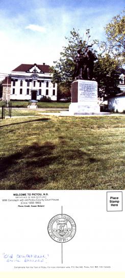 WWI Cenotaph with old Pictou County Court House (circa 1856-1860) "Old Courthouse since burned" Photo Credit: Susan Moland