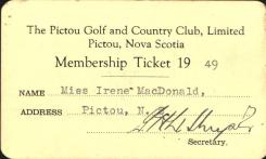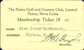 Pictou Golf Club membership card for Catherine Irene MacDonald of Pictou, NS