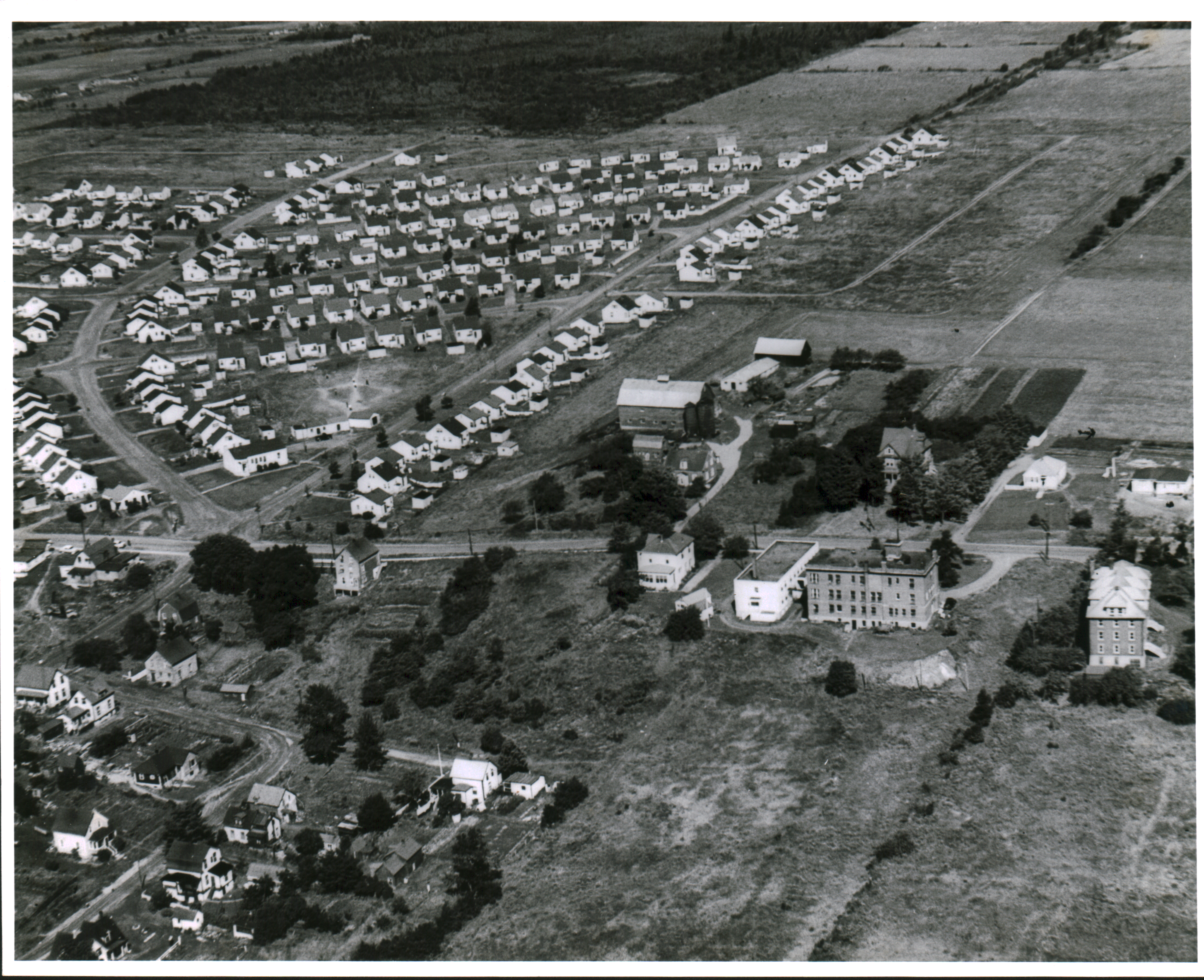 Gray aerial-view photograph of Pictou heights with focus on the war houses. Unknown year.