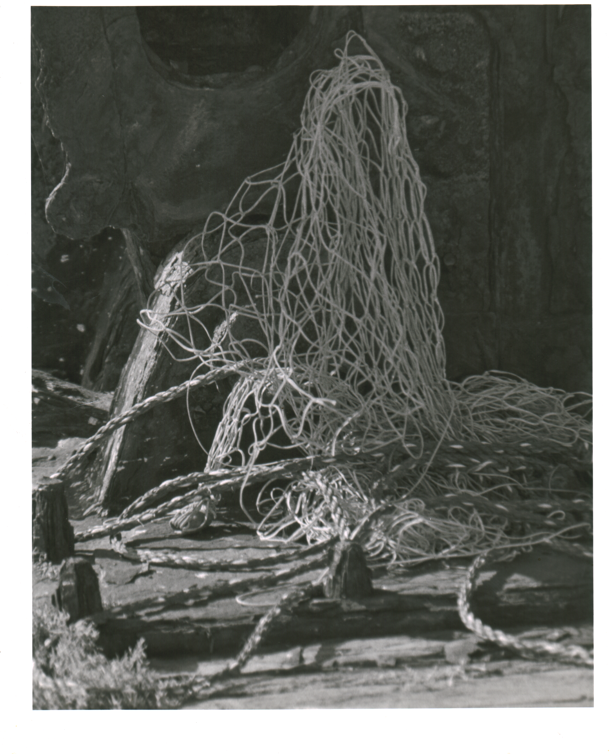 Grey photograph of a net and some rope on the beach. Unknown year and location.
